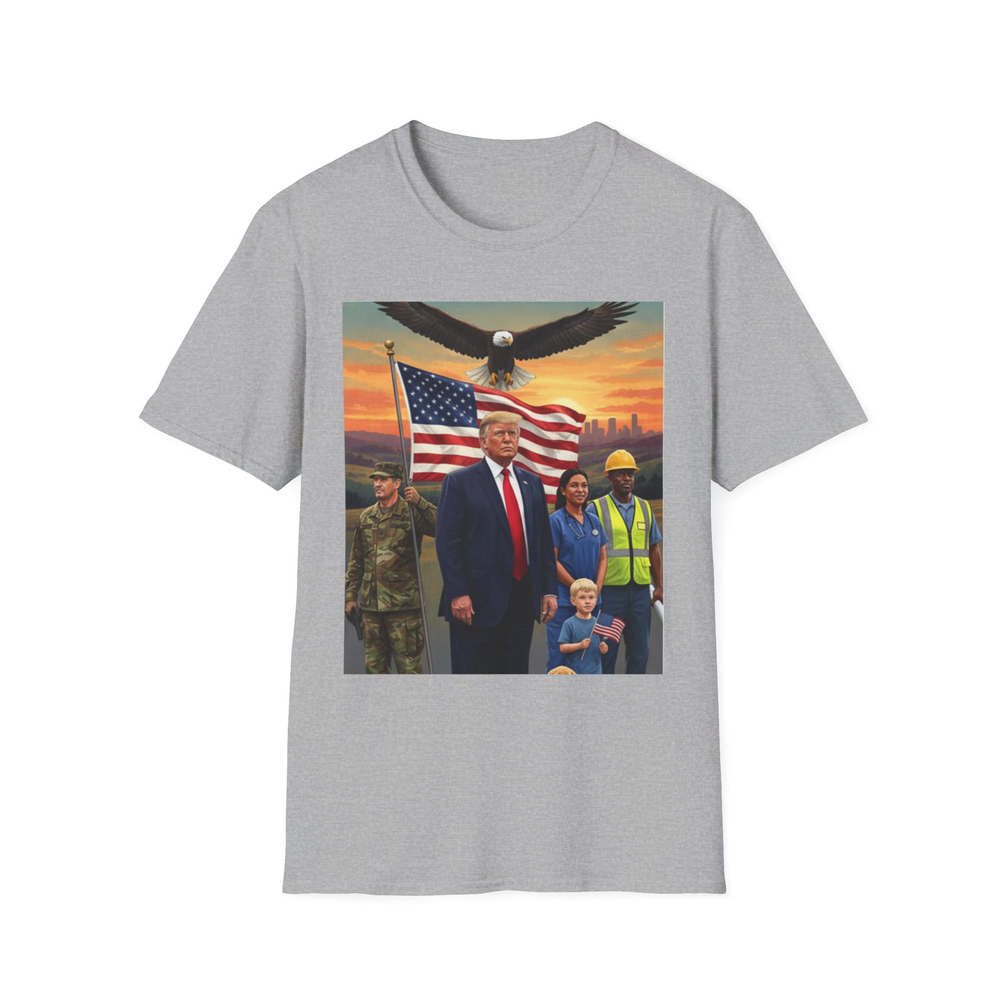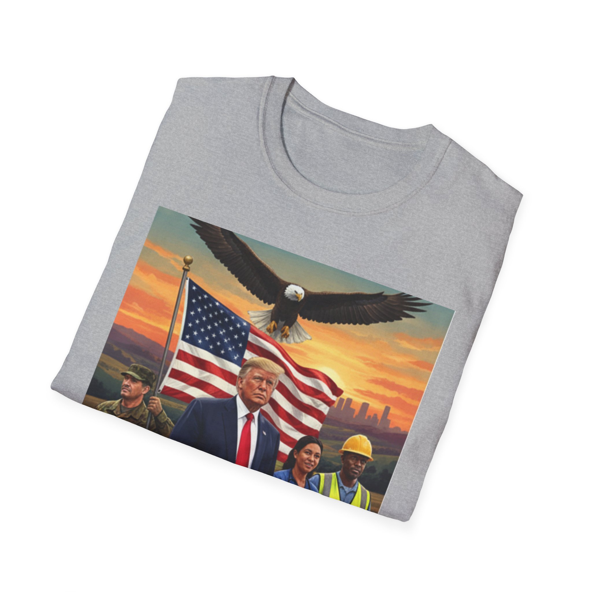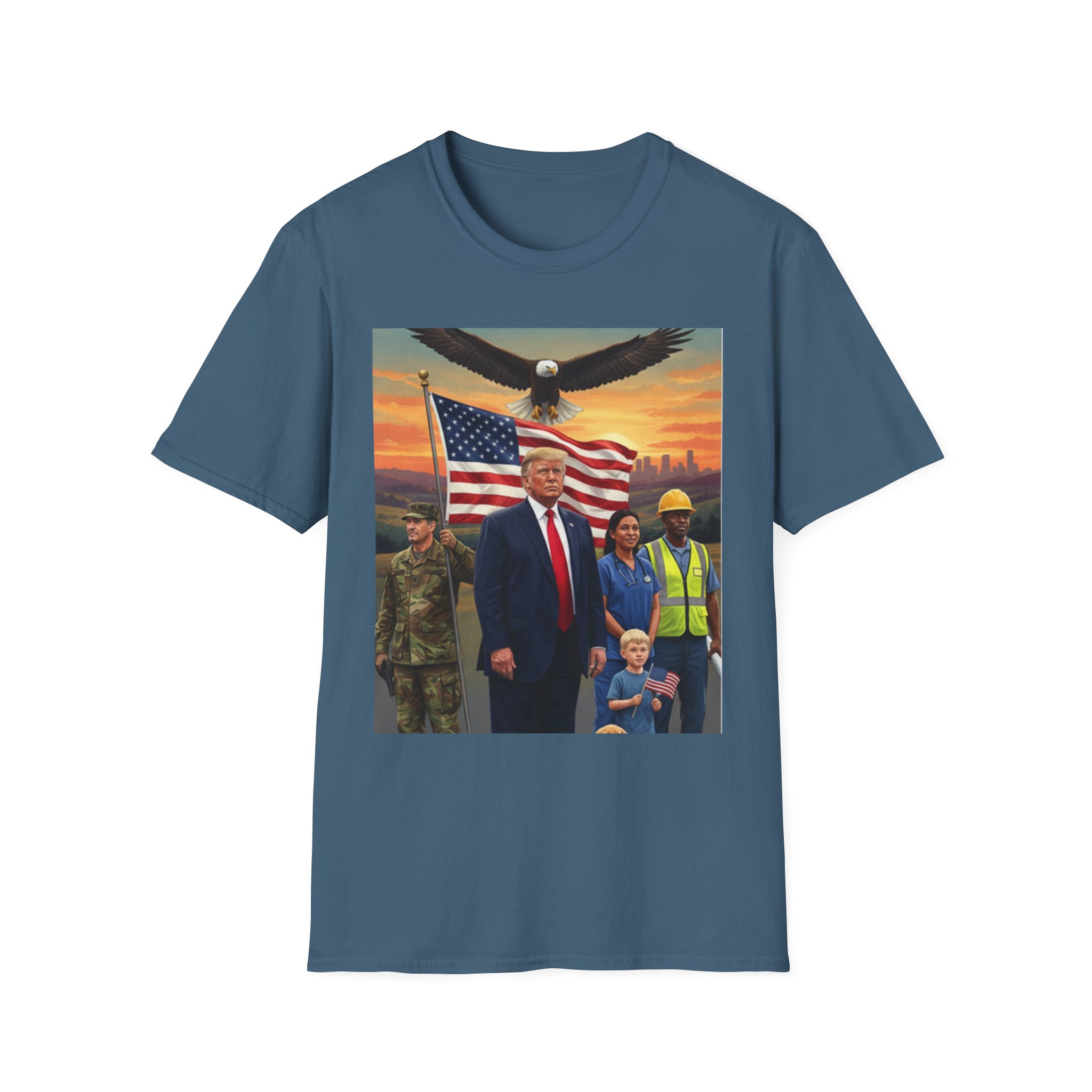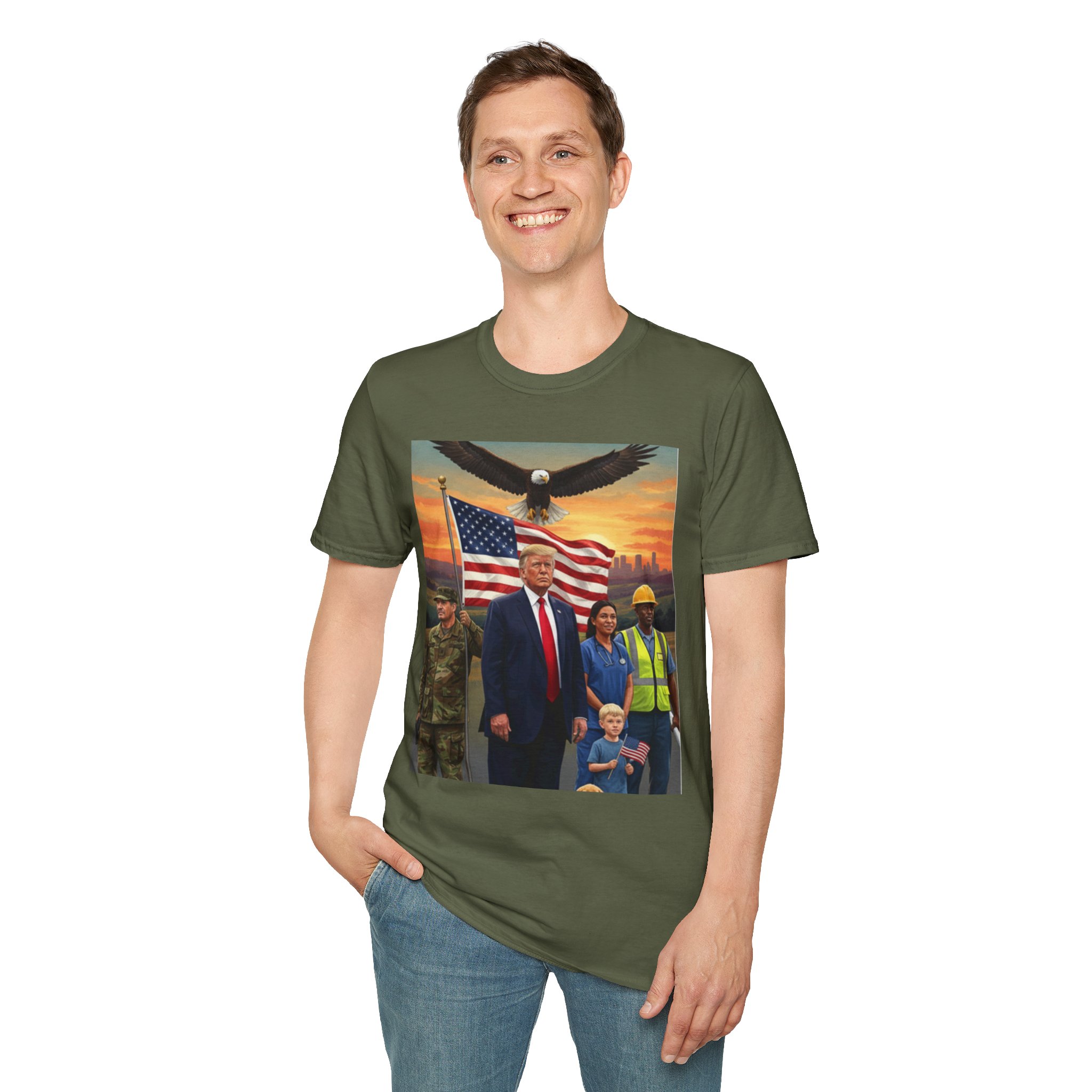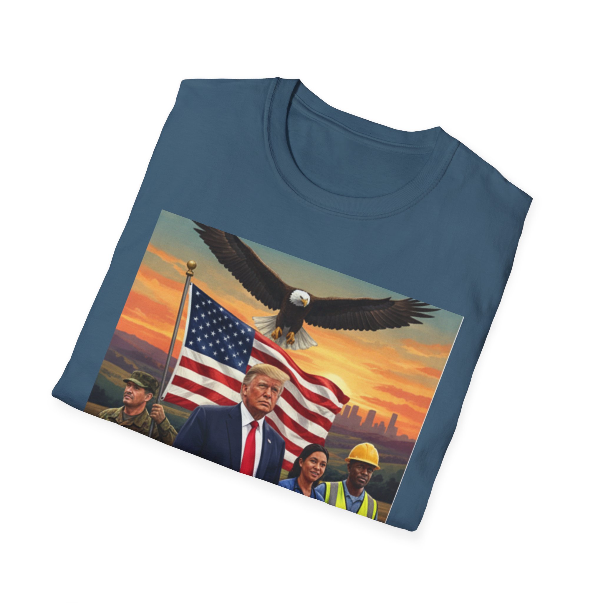 A patriotic T-Shirt featuring an original work from our “Leading America” of President Trump leading a group of Americans showcasing USA pride and the will to Make America Great Again. Perfect for those who want to display their patriotic spirit and support for the USA. Ideal for Trump supporters and those celebrating American holidays and events.