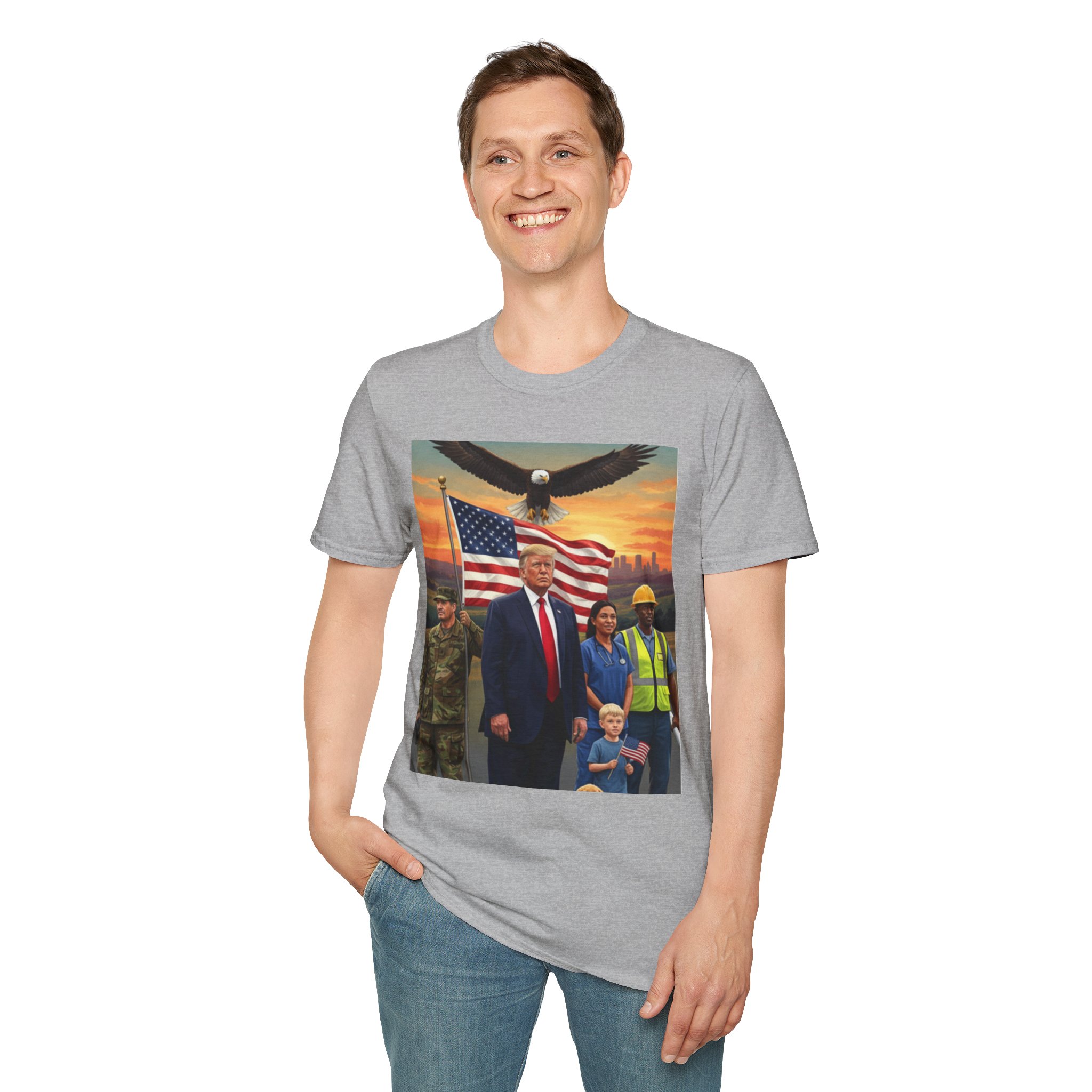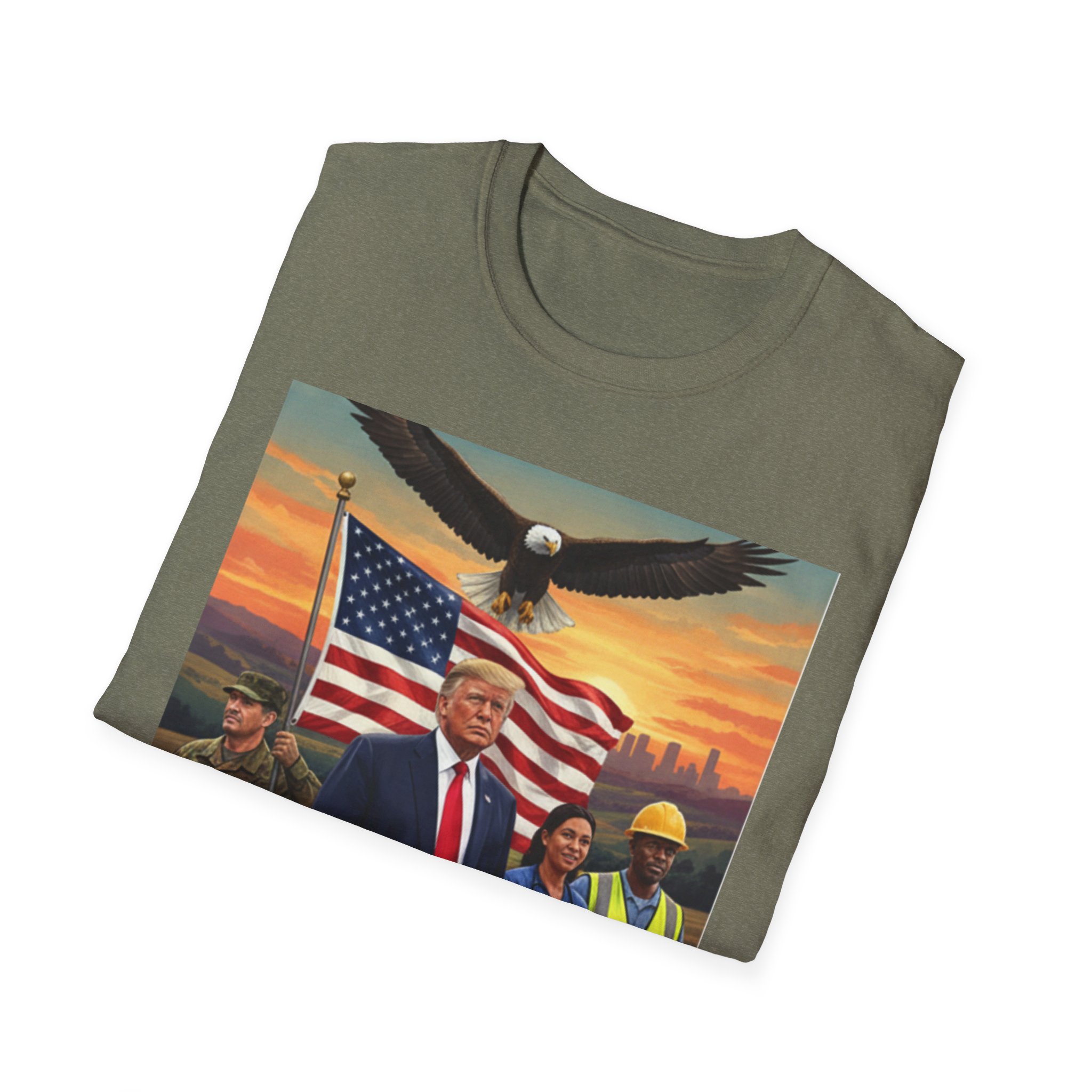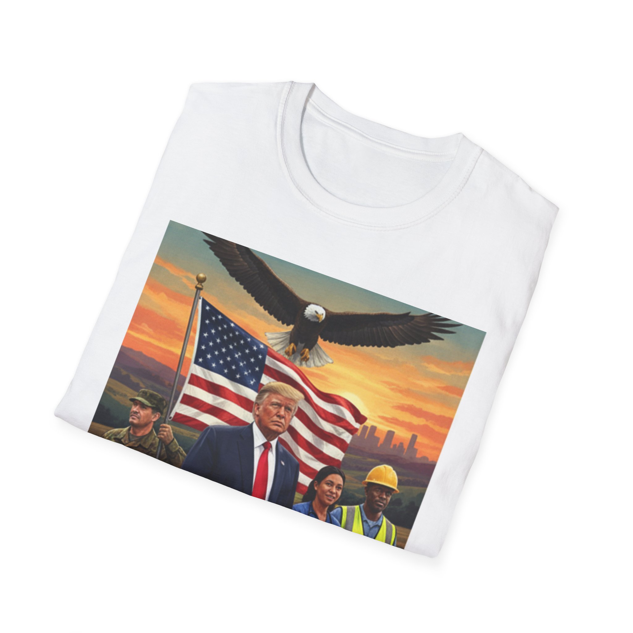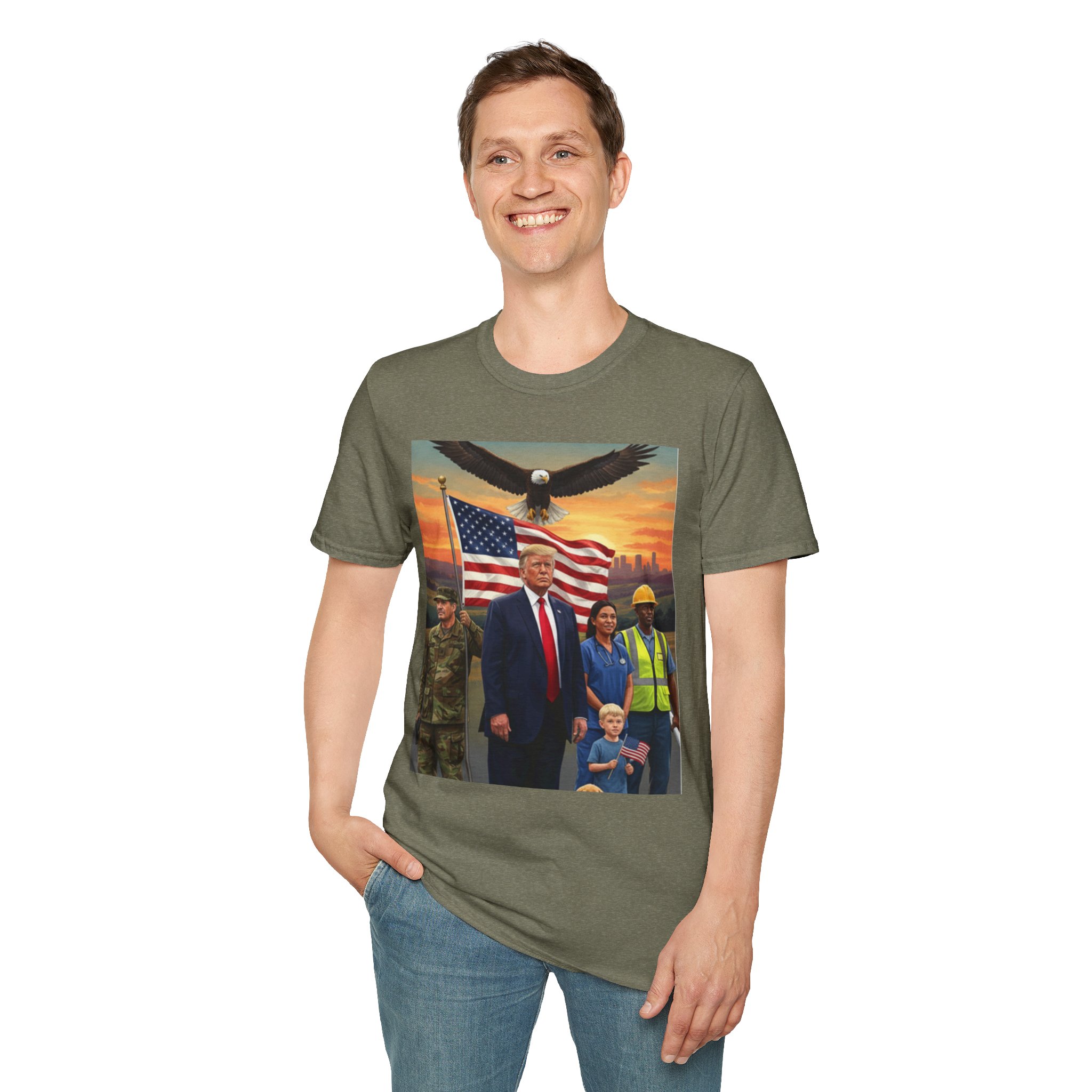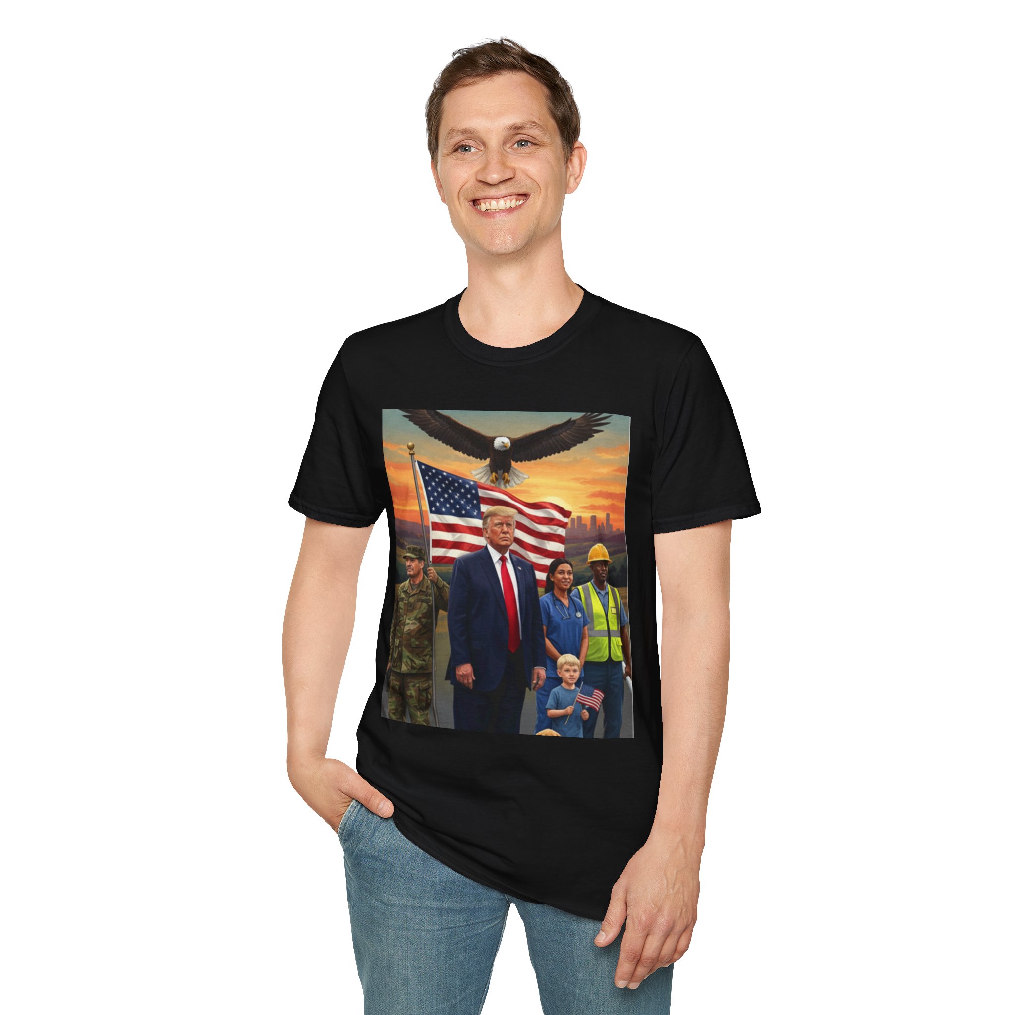 A patriotic T-Shirt featuring an original work from our “Leading America” of President Trump leading a group of Americans showcasing USA pride and the will to Make America Great Again. Perfect for those who want to display their patriotic spirit and support for the USA. Ideal for Trump supporters and those celebrating American holidays and events.
