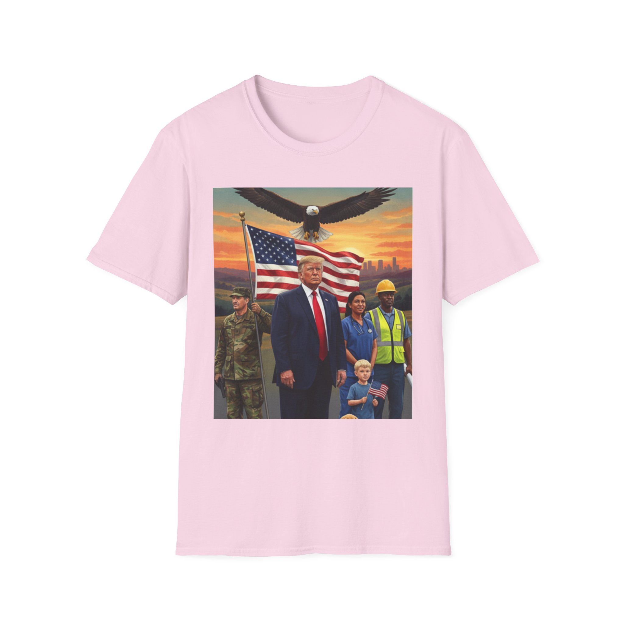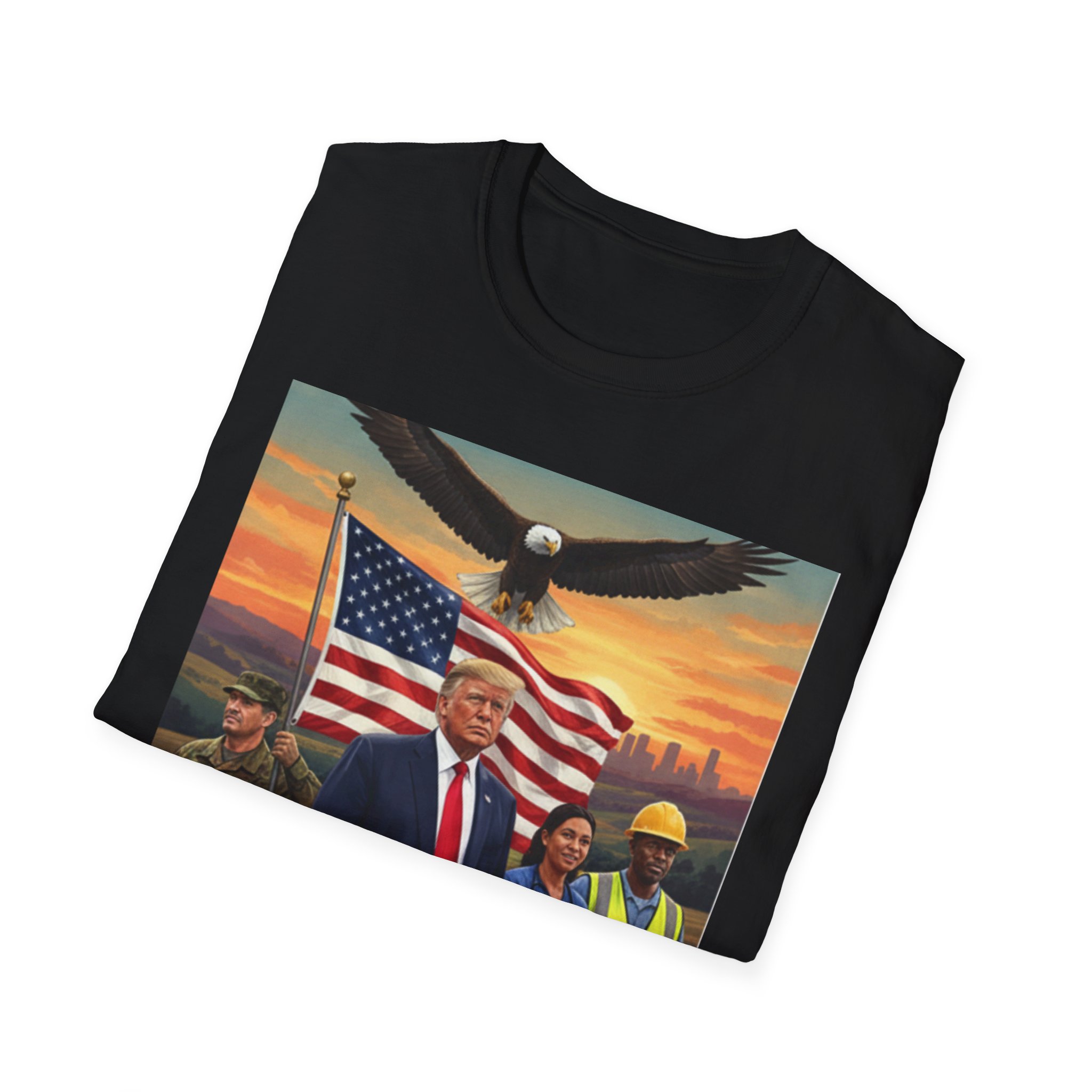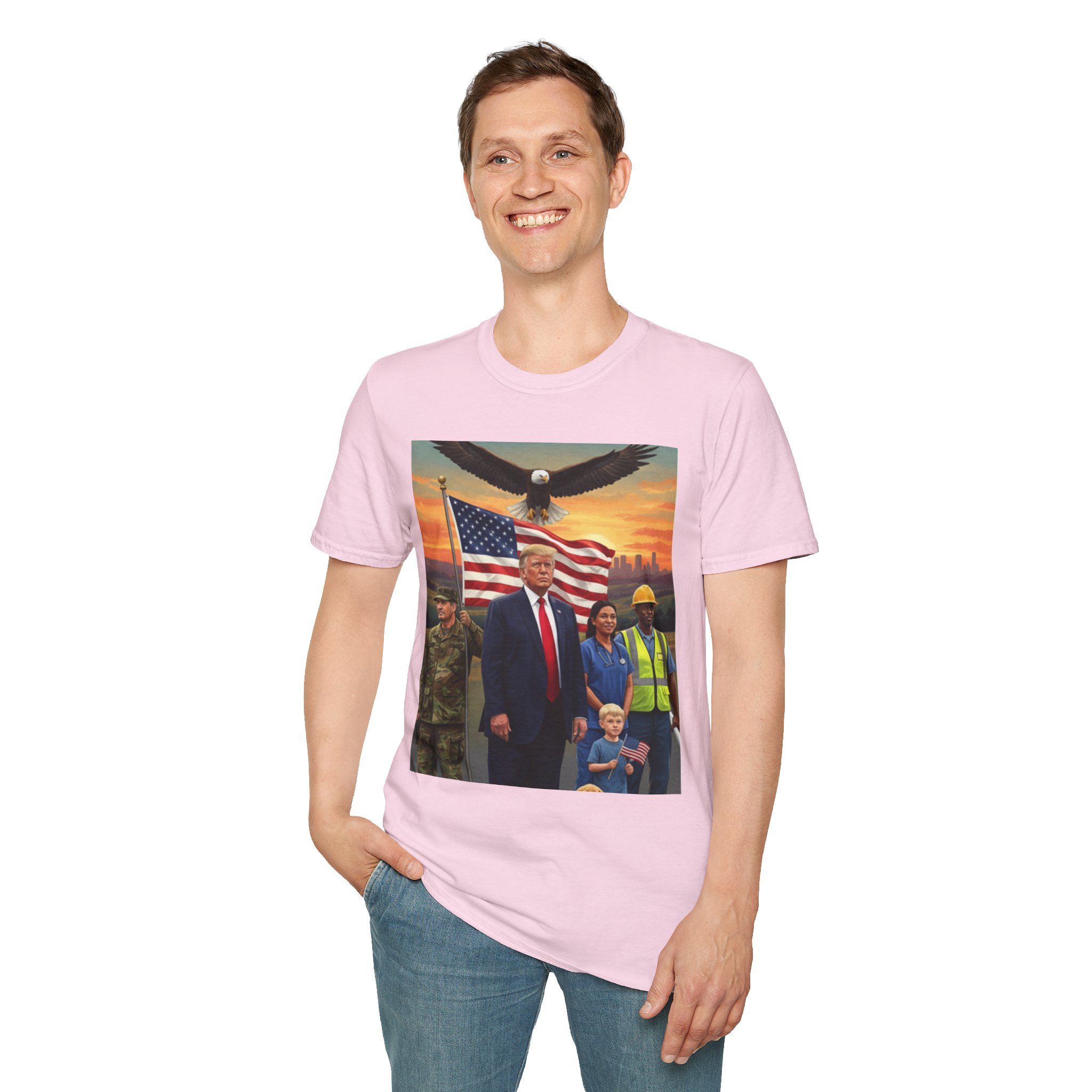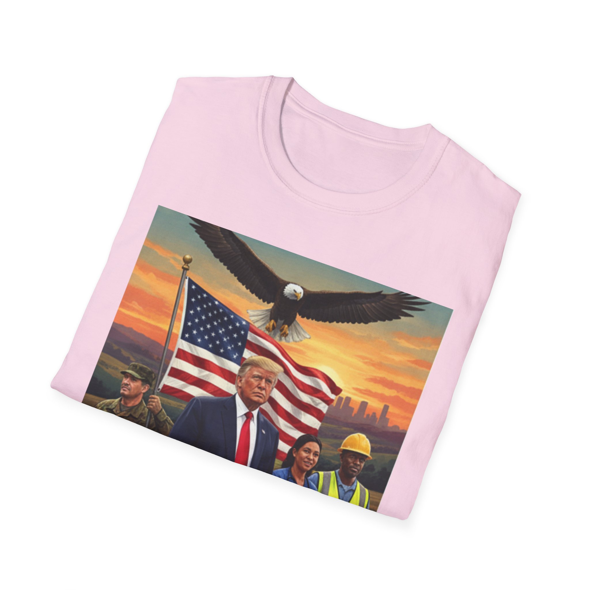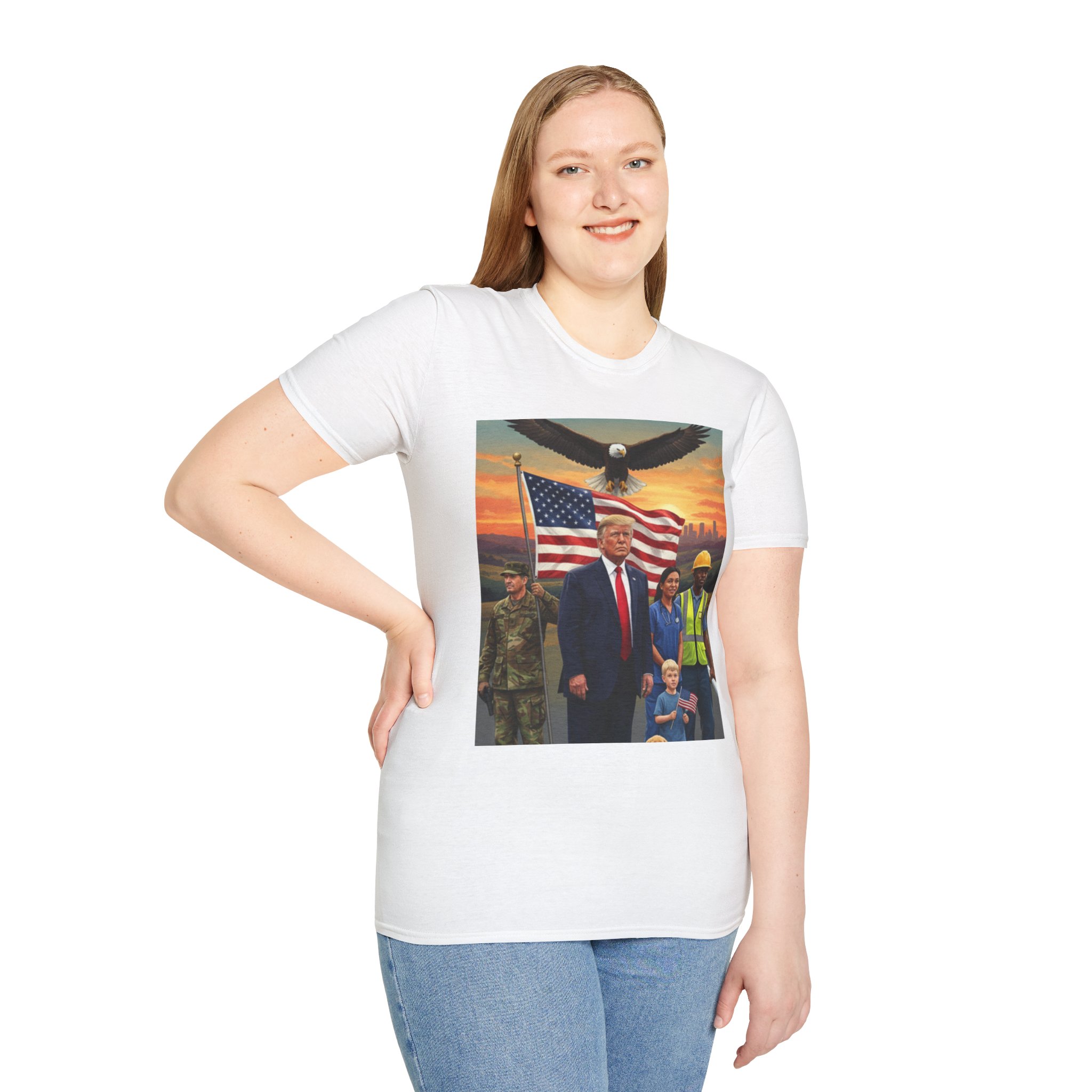 A patriotic T-Shirt featuring an original work from our “Leading America” of President Trump leading a group of Americans showcasing USA pride and the will to Make America Great Again. Perfect for those who want to display their patriotic spirit and support for the USA. Ideal for Trump supporters and those celebrating American holidays and events.